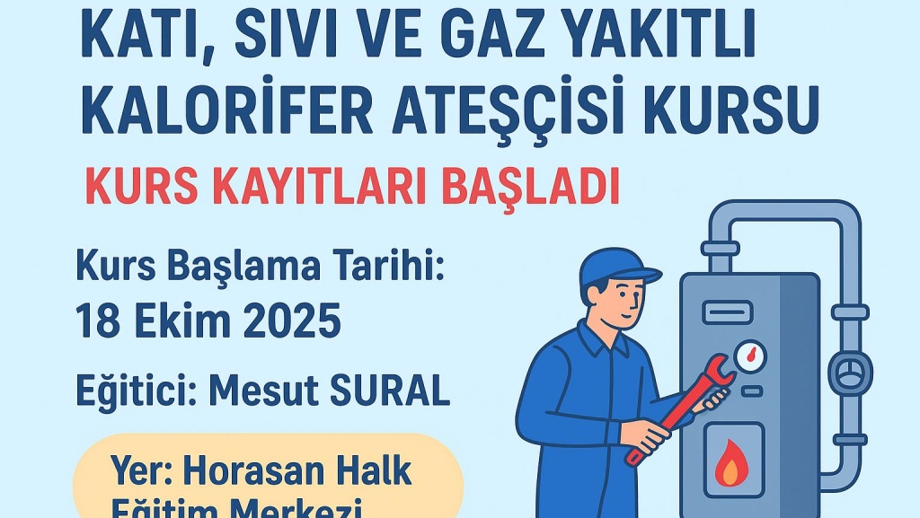 Horasan Halk Eğitim Merkezi tarafından düzenlenen Katı, Sıvı ve Gaz Yakıtlı Kalorifer Ateşçisi Kursu için kayıtlar başladı. Kursumuz, 18 Ekim 2025 tarihinde başlayacak olup, alanında deneyimli eğitici Mesut SURAL tarafından verilecektir. Bukurs sayesinde kalorifer sistemlerinin güvenli ve verimli şekilde çalıştırılmasını öğrenebilir, sertifika alarak iş fırsatlarınızı arttırabilirsiniz.